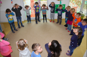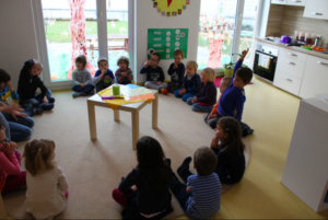 Die Kinder lernen Regeln und Konsequenzen, die folgen, wenn sie gegen die Regeln verstoßen. Sie erfahren, dass sie in einer Gruppe auf andere Rücksicht nehmen müssen, sich auch einmal unterordnen, dass sie anderen helfen oder ihnen von anderen geholfen wird. Sie lernen, Konflikte auszuhalten und Konflikte zu lösen. Unsere Kinder erleben, dass sie schon viel können, erforschen neugierig neue Dinge und bauen sich Tag für Tag ihr Bild von der Welt, den Dingen und Menschen.