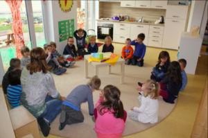 Im Morgenkreis gibt es neben einem kurzen Angebot wie Spiel oder Lied eine Erzähl- und Planungsrunde. Die Kinder können erzählen, was ihnen wichtig erscheint und überlegen, wer aus ihrer Gruppe da ist und wer fehlt. Die MitarbeiterInnen informieren welche Angebote geplant sind und unterstützen die Kinder bei der Entscheidung, was sie heute tun und womit sie beginnen wollen.